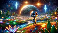 In een levendig, interstellair tuinlandschap, doorkruist door een rivier en bloeiend onder een kosmische hemel, wandelt een klein buitenaards wezen. De vegetatie is bedekt met fonkelende lichtjes die de grond een prachtige glans geven. Spookachtige figuren zweven boven de rivier, in een dans van licht en schaduw. Op de achtergrond verrijst een enorme planeet, omringd door sterren en zonnestralen die een hemelse gloed over het hele tafereel werpen. De vredige sfeer wordt versterkt door het zachte ruisen van het water en de schittering van de omgeving.