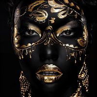 Dit adembenemende portret van een vrouw combineert de donkere diepte van de nacht met de stralende hoogtepunten van goud. De sierlijke gouden ornamenten die het gezicht en de lippen sieren creëren een betoverend contrast en geven het beeld een aura van grandeur en mysterie. De minutieuze details en glinsterende gouden accenten geven de compositie een bijna goddelijke elegantie die de kijker meeneemt naar een wereld van mystieke schoonheid. Ideaal voor liefhebbers van klassieke en moderne kunst die zich willen laten inspireren door diepzinnige en krachtige beelden.