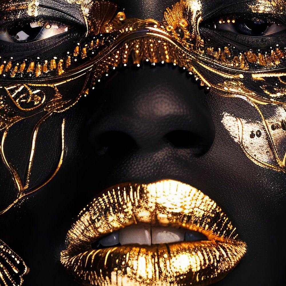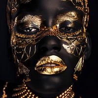 Dit adembenemende portret van een vrouw combineert de donkere diepte van de nacht met de stralende hoogtepunten van goud. De sierlijke gouden ornamenten die het gezicht en de lippen sieren creëren een betoverend contrast en geven het beeld een aura van grandeur en mysterie. De minutieuze details en glinsterende gouden accenten geven de compositie een bijna goddelijke elegantie die de kijker meeneemt naar een wereld van mystieke schoonheid. Ideaal voor liefhebbers van klassieke en moderne kunst die zich willen laten inspireren door diepzinnige en krachtige beelden.
