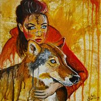 De relatie tussen wolven en mensen is ambivalent. Dit schilderij laat de positieve kant zien: een natuurminnende jonge vrouw met mythologische symbolen op haar gezicht omhelst een volwassen wolf. Beiden kijken in dezelfde richting. Het samenleven van wolven en mensen kan grotendeels soepel verlopen, maar dan wel in een normale vorm waarin mens en wolf elkaar met rust laten en respecteren. Waarbij de wolf nogal mensenschuw is. Helaas hebben de sprookjes van de gebroeders Grimm de wolf een negatief beeld gegeven in de hoofden van kinderen - een blijvend beeld. Het dwingt ons om onzorgvuldige gewoonten te veranderen, maar niet om onszelf te beperken.