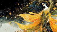 Midden in een razende storm staat een mysterieuze vrouw met lang, zwart haar op. Haar lichtgevende, vloeiende jurk schijnt fel tegen de sombere achtergrond. De contrasten tussen de duisternis van de achtergrond en de levendige aanwezigheid van de vrouw geven de foto een fascinerende sfeer. Het spel van licht en schaduw benadrukt de mystiek en gratie van deze scène, terwijl de stormachtige omgeving een vleugje drama toevoegt. De vrouw vertegenwoordigt zowel kracht als elegantie en haar verschijning gaat gepaard met een vleugje magie. Het lange, zwarte haar wappert in de wind, terwijl de lichtgevende jurk als een levend element in de scène fungeert. Dit kunstwerk nodigt de kijker uit om zich onder te dompelen in de fascinerende wereld van deze mysterieuze vrouw, die een unieke schoonheid belichaamt tussen de kalmte en de storm.