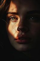 Dit indrukwekkende portret vangt de mysterieuze schoonheid van de blik van een vrouw, die schittert in het spel van licht en schaduw. De close-up benadrukt de fascinerende blauwe ogen, sensuele lippen en de fijne textuur van de huid. Het dramatische licht benadrukt de intense gelaatstrekken en creëert een mystieke maar intieme sfeer.…