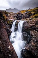 Dit is Schotland op zijn puurst: rauw, mysterieus en adembenemend mooi. Deze foto van de Fairy Pools op het Isle of Skye vangt precies dat magische gevoel dat je krijgt wanneer je midden in de wildernis staat, omringd door ruige rotsen, stromend water en wolken die als een deken over de bergen glijden.
