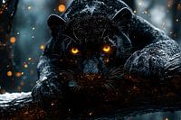 Dit indrukwekkende ontwerp toont een zwarte panter die zich gedetailleerd uitstrekt op een tak, met vurige, intense ogen die direct de aandacht trekken. De omringende achtergrond is mysterieus en donker, met subtiele tinten van blauw en oranje vonken die het geheel een dramatisch en krachtig contrast geven. Perfect voor liefhebbers van wilde dieren of degenen die een krachtig, opvallend kunstwerk in hun interieur willen opnemen. Ideaal voor moderne en eigentijdse ruimtes, voegt dit stuk een vleugje mysterie en elegantie toe aan elke omgeving.