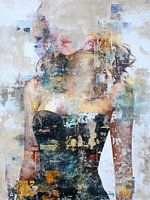 Mystique of the Abstract Woman - Dit abstracte vrouwen schilderij toont een gestileerde vrouwfiguur in een collage van textuurrijke en kleurrijke verfstreken, waarbij stukjes gezicht en haar semi-herkenbaar zijn door de gelaagdheid en transparantie van de toegepaste materialen.