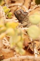 Süsses kleines Chamäleon zwischen den Dollarbüschen in der Namib Wüste zwischen Walvis Bay und Swakopmund, Namibia.
