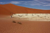 Het adembenemende landschap van de Namib woestijn / Deadvlei in Namibië. Enkele oude knoestige bomen trekken de aandacht. De Deadvlei is een zout- en kleipan midden in de duinen van het Namib Naukluft Park in Namibië.