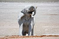 Deze vrouwelijke olifant, helemaal bedekt met opgedroogde grijze modder, heeft veel plezier. Deze prachtige grijze reus werd ontdekt in Etosha National Park, Namibië. Haal een stukje Afrika in huis!