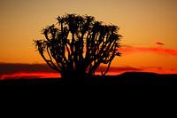 Kokerboom in de zonsondergang. De kokerboom is een surrealistische en fascinerende plant. Deze bomen zijn te vinden in de buurt van Keetmanshoop, Namibië, Afrika, voornamelijk in het zogenaamde kokerbomenbos. Het silhouet van de boom vormt een prachtig contrast met de vurige tinten van het licht als de zon ondergaat.