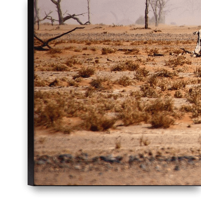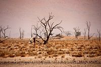 Het magische landschap van de Namib-woestijn in Namibië is hier afgebeeld in pastelkleuren. Deze zachte kleuren worden gecreëerd door het zonlicht en het zand dat door de wind wordt opgewerveld. De oude, knoestige bomen vormen een prachtig contrast hiermee.