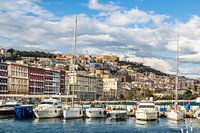 Een schilderachtig uitzicht vanaf de Lungomare Caracciolo in Napels laat de stad van zijn charmante maritieme kant zien. Langs de promenade dobberen kleine vissersbootjes en elegante jachten rustig in het water van de Golf van Napels. Op de achtergrond zie je de kleurrijke huizen van de stad, die als terrassen tegen de helling van de Vomero-heuvel liggen; een fascinerende mix van historische architectuur en stedelijke levendigheid. Het zuidelijke licht laat de kleuren gloeien, terwijl de lucht dramatisch is bezaaid met witte wolken. Deze foto straalt een pure mediterrane levenshouding uit; een plek om aan te komen, diep adem te halen en te genieten.