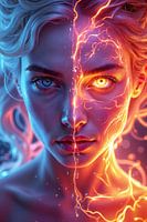 In het felle schijnsel van neonlicht ontwaakt een gezicht tussen twee elementen. Een vrouw, half vuur, half ijs, staat in de elektrische gloed van een toekomst waarin mens en machine samensmelten. De linkerkant van haar gezicht straalt koelblauw, terwijl vurige aderen de rechterzijde verlichten. Elektrische lijnen lopen als levend licht…