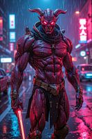 De regen valt in zilveren lijnen over de glimmende straat, het neon breekt de nacht in rood en blauw. Daar staat hij – een demon van vuur en staal, gesmeed uit energie en woede. Zijn huid glanst onder het licht, zijn ogen branden als vurige sterren. Achter hem vervaagt de stad tot een storm van kleur, rook en elektriciteit. Elke beweging ademt kracht, elke ademslag klinkt als donder.