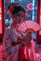 Tussen de neonlichten van de megastad staat zij stil – sereen, gracieus en onbereikbaar. Haar witte kimono glanst als vloeibare zijde, verlicht door het kunstmatige licht van de stad. Achter haar dansen kleuren, maar zij blijft rustig, een beeld van perfecte beheersing. De waaier in haar hand verbergt haar blik slechts deels, een blik…
