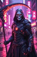 Een duistere sikkelman stapt door de neon-doordrenkte straten van de toekomst, zijn schedel brandt bloedrood terwijl de zeis in zijn handen gloeit als gesmolten vuur. Gehuld in zwart pantser en een kap verschijnt hij als een apocalyptische boodschapper, geboren uit de schaduwen van de stad.