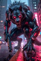 Tussen de gloeiende gevels van de megastad hurkt hij – half mens, half beest, een roofdier uit vlees, staal en energie. De regen stroomt over zijn vacht, het neonlicht tekent scherpe lijnen over spieren en metaal. Zijn ogen branden als kolen in het donker, en in zijn hand houdt hij een wapen – futuristisch, dodelijk, gemaakt voor de jacht in een wereld die nooit slaapt.