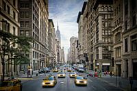 Unieke momentopname van het verkeer op 5th Avenue. Het decoratieve motief is decoratief en toont de unieke architectuur van de Amerikaanse metropool. Een klassiek straatbeeld uit Manhattan!