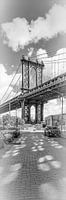 De Manhattan Brug over de East River en verbindt de twee delen van de stad, Manhattan (Chinatown) en Brooklyn. Direct op en onder de brug DUMBO, een groeiende woonwijk. Dit beeld wordt verkregen van de Washington Street. Klassieke monochrome stedenbouw van de Stad New York, in panoramisch formaat, en leeg van mensen.