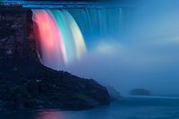 Niagara Falls - Illuminated Horseshoe Falls a.k.a. Canadian Falls as Seen from the Canadian Side in the Evening Elke avond verlichten kleurrijke lichten de Falls. De rots links is Goat Island (Verenigde Staten). De witte vlekken op de rots zijn vogels.