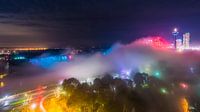 Niagara Falls, Canada/USA - Mist over de rivier en de stad gezien vanaf de Canadese kant bij nacht