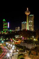 Fantastische motief van de Rainbow Bridge, aan de canadese kant, met de Skyline van de stad van Niagara Falls.