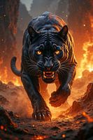 Uit de gloed van een brandende wereld springt hij naar voren – een zwarte panter, omringd door vlammen, zijn blik een storm van vuur en duisternis. Zijn bewegingen vloeien als schaduwen, maar elke stap draagt de kracht van naderend onheil.