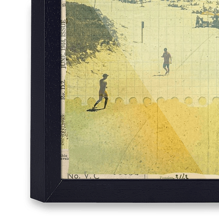 "Nostalgic Shores” is een visuele reis naar een zomerdag uit de jaren 1970. De collage, badend in gele en aquagroene tinten, mengt de levendige sfeer van een vintage strand met elementen van retro formulieren, oude vintage foto's en geruit papier