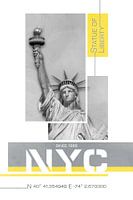 Klassiek stadsbeeld vanuit New York City in een modern design. Coördinaten en verdere informatie gaan samen met het Vrijheidsbeeld tot een minimalistische totaalindruk.