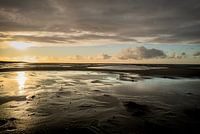 De omstandigheden op de Waddeneilanden in de herfst kunnen van de ene minuut op de andere veranderen. Deze foto is gemaakt op dezelfde dag als de foto Windkracht 9 die ook verkrijgbaar is in mijn shop, maar de wind was gaan liggen en waterplassen hadden het strand veranderd in een bijna surrealistisch landschap. De zon ging onder net toen nieuwe stormwolken verschenen en de onheilspellende donkere lucht hangt boven het blauw en de ondergaande zon, waardoor dit een buitenaards tafereel wordt.