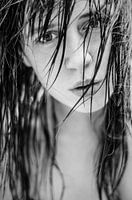 Dit zelfportret, genomen direct na een regenbui, is een meesterwerk van emotionele expressie en fotografische finesse. Het beeld, omgezet in zwart-wit in Photoshop, versterkt de intensiteit en emotionele diepte, waardoor de kijker direct wordt gegrepen door de rauwe schoonheid van het moment. De focus ligt volledig op het gezicht en het lange, vochtige haar van de geportretteerde, met regendruppels die zichtbaar in het haar hangen en het gezicht sieren, waardoor een gevoel van kwetsbaarheid en frisheid wordt toegevoegd.