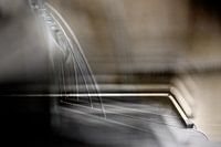 De ritmische, gebogen lijnen suggereren een rij stoelen of toetsen, maar zonder duidelijke bron of einde. Alles is vervloeiend, alsof de tijd zich uitstrekt in lagen. Het monochrome kleurgebruik versterkt de contemplatieve sfeer: ingetogen, verstild, bijna ongrijpbaar.