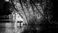 Een aalscholver staat de vleugels te drogen na de onderwaterjacht. Hun vleugels hebben namelijk geen vetlaag. Ze moeten namelijk diep kunnen duiken en met een vetlaag lukt dat niet goed. Hun vleugels worden dan doorweekt van het water en moet dan drogen aan de wind. Dat doen ze door de vleugels te spreiden. Als je een aalscholver zo…