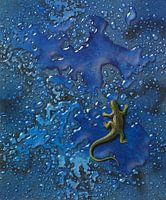De foto toont een klein geel reptiel in een blauwe druipende omgeving