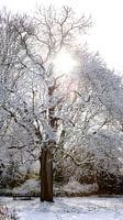 Een boom is takje voor takje bedekt met sneeuw die de voorgaande nacht viel. Je kan daaruit afleiden dat het windstil was tijdens de sneeuwbui, zodat de sneeuw rustig kon vallen en hechten aan de takken. Daarna brak de felle zon door die van de boom en de omgeving een winter wonderland maakte. Hier schijnt de felle zon door de besneeuwde takken heen.