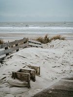 Deze foto ademt een rauwe, ongerepte sfeer. Het zand heeft zich een weg gebaand over een houten pad en deels ingestorte houten constructies, alsof de natuur langzaam bezit neemt van wat ooit door mensen is neergezet. De verweerde houten planken en het gebroken hekwerk versterken het gevoel van vergankelijkheid.