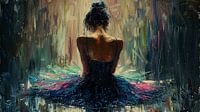 De zachte lichtval op haar blote rug creëert een intieme sfeer, waarbij de textuur van de verf op haar huid subtiel en gevoelig is aangebracht. De omringende achtergrond is abstract en chaotisch, met penseelstreken in gemengde kleuren die variëren van donkere tot lichte tonen. Deze contrasten lijken de emotionele toestand van de danseres te weerspiegelen, alsof ze in een moment van introspectie is verzonken na een intensieve uitvoering. Haar tutu is levendig, met felle roze, blauwe en groene tinten, wat een sterk contrast vormt met de rustige, bijna sombere houding van haar lichaam.
