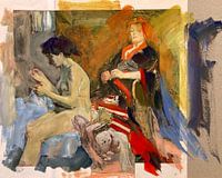 Een collage samengesteld uit werken van bekende kunstschilders. "Appropriation art", het toeëigenen van kunst uit het verleden om daar een nieuwe draai aan te geven met verf. Een eigentijds kunstwerk dat een klassieke figuratieve voorstelling heeft maar tevens zeer modern en tijdloos oogt. Prachtig in ieder interieur.
