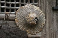 De chinese boer heeft zijn hoed en cape klaar hangen voor de volgende klus op het land. Traditionele noeste arbeid in het achterland van China: hard werken en een zeer eenvoudig leven samen met zijn vrouw.
