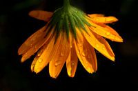 Een close-up foto van een Goudsbloem die is gaan hangen met een regenbui. Na de bui viel de zon mooi op de bloemblaadjes met druppeltjes. De oranje bloem steekt mooi af tegen de schaduw van de achtergrond.