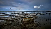 Na heftige regen een wind komt er zonneschijn boven de Waddenzee. Rechts in de foto is te zien dat er een regenboog ontstaat.