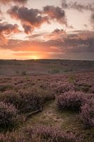 De zon komt net boven de horizon uit op de Posbank in N.P. de Veluwezoom. Midden augustus staat de heide volop in bloei en dat in combinatie met een mooie zonsopkomst en het glooiende landschap maakt het meer dan de moeite waard om de wekker eens om 03.30 te zetten. Overigens was het krap aan, tijdens het in de regen naar boven wandelen…