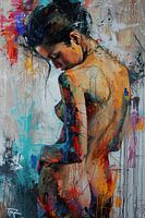 Naakt Abstract - Dit intrigerende stuk verenigt de schoonheid van een vrouwelijke figuur met een dynamische explosie van kleur en textuur, waardoor een modern portret ontstaat dat emotie en beweging weerspiegelt. De gedurfde contrasten tussen de koele blauwtinten en de warme oranjes creëren een visueel intrigerend tafereel dat in elke moderne ruimte een statement zou maken.