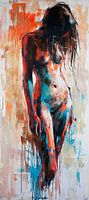 Naakt | Figuur in Contrast | Naakt - Dit statement stuk vertoont een dynamische, expressieve uitbeelding van een vrouwen figuur, gevangen in een wirwar van krachtige rood- en blauwtinten, onderbroken door rustgevende beige en witte achtergronden. De ruwe penseelstreken en druipende verf dragen bij aan de levendigheid en ruwe emotie van het werk, wat het geschikt maakt voor een modern interieur dat hunkert naar een kunstwerk met een ziel.