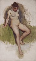 Een jonge vrouw zit bloot op dit naaktportret. De meid is op het portret gezet als sensueel naaktmodel, waardoor haar ontblote benen, heupen, buik, torso en borsten zijn neergezet op het kunstwerk. De groene ondergrond en haar rode blooskaken springen er uit.