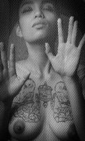 Zwartwit stukje kunst gevangen in een foto van een vrouw mat tatoeages als naaktmodel achter een gaas. Van de meid zijn de tattoos, gezicht, handen, onderarmen en torso met borsten en tepels bloot en stijlvol op een donker portret gezet, dus een naaktportret in de categorie naaktfotografie.