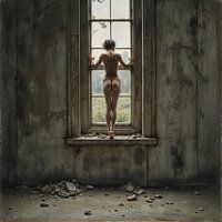 Het schilderij toont een naakte vrouw, staand in een betonnen vensterbank, omringd door de kille, rauwe muren van een verlaten fabriek. De betonnen wanden zijn gehavend door de tijd, getekend door scheuren en vochtplekken, stille getuigen van verval en verlatenheid. Op de vloer ligt verspreid puin: gebroken beton, stof dat zich als een…