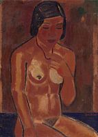 Portret van een vrouw die bloot poseert met een ketting om de nek, dus een naaktportret. Van de dame staan de bovenbenen, buik, torso met borsten, schouders en armen ontkleed op het schilderij.