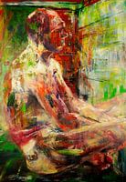Schilderij van een man in zithouding. Naakt model. Spontaan en kleurrijk geschilderd op de academie.