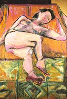 Schilderij van een vrouw, naakt liggend op bed. Spontaan en kleurrijk geschilderd op de academie