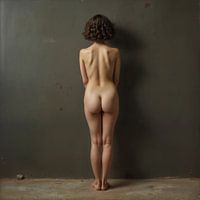 Het schilderij toont een naakte vrouw die met haar gezicht naar een donkere muur staat, haar rug en achterzijde volledig zichtbaar voor de aanschouwer. Haar houding is recht, maar niet gespannen—alsof ze wacht, maar zonder verzet. De schaduwen spelen over haar huid, waardoor haar vorm zacht afsteekt tegen de duisternis van de achtergrond.